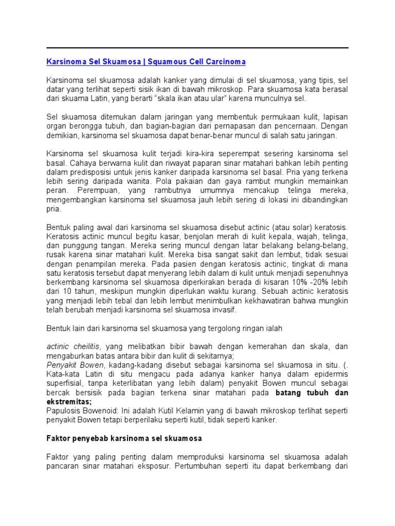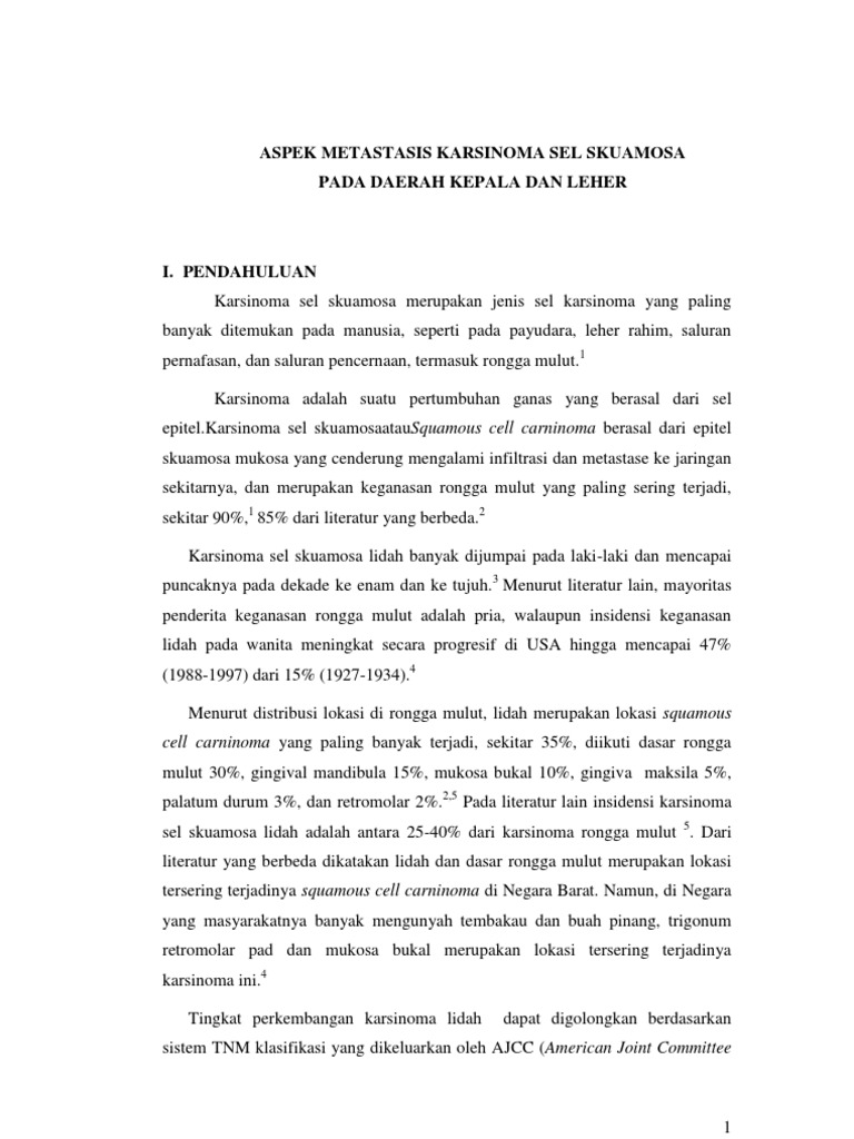 Karsinoma Sel Skuamosa Pdf. Tumor ini terjadi pada tempat yang diliputi epitel gepeng berlapis seperti: kulit, mulut, lidah, laring, serviks uteri, sel transisional di kandung kemih. Secara mikroskopik, karsinoma skuamosa menunjukkan sarang- sarang dan pulau-pulau sel epitel invasif dengan berbagai derajat diferensiasi (misalnya keratinisasi).